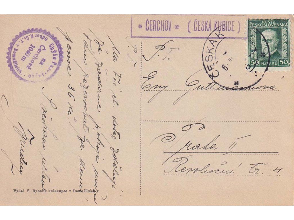 Poštovna, *ČERCHOV* (ČESKÁ KUBICE) + DR Česká Kubice, pohlednice zasl. v roce 1925 do Prahy
