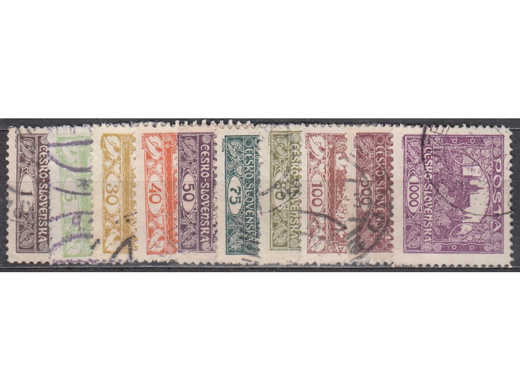 Poštovní známky 1-1000h Hradčany, 10 ks různých hodnot s ministr. Řz.11 1/2 nebo hrubší, razítkované