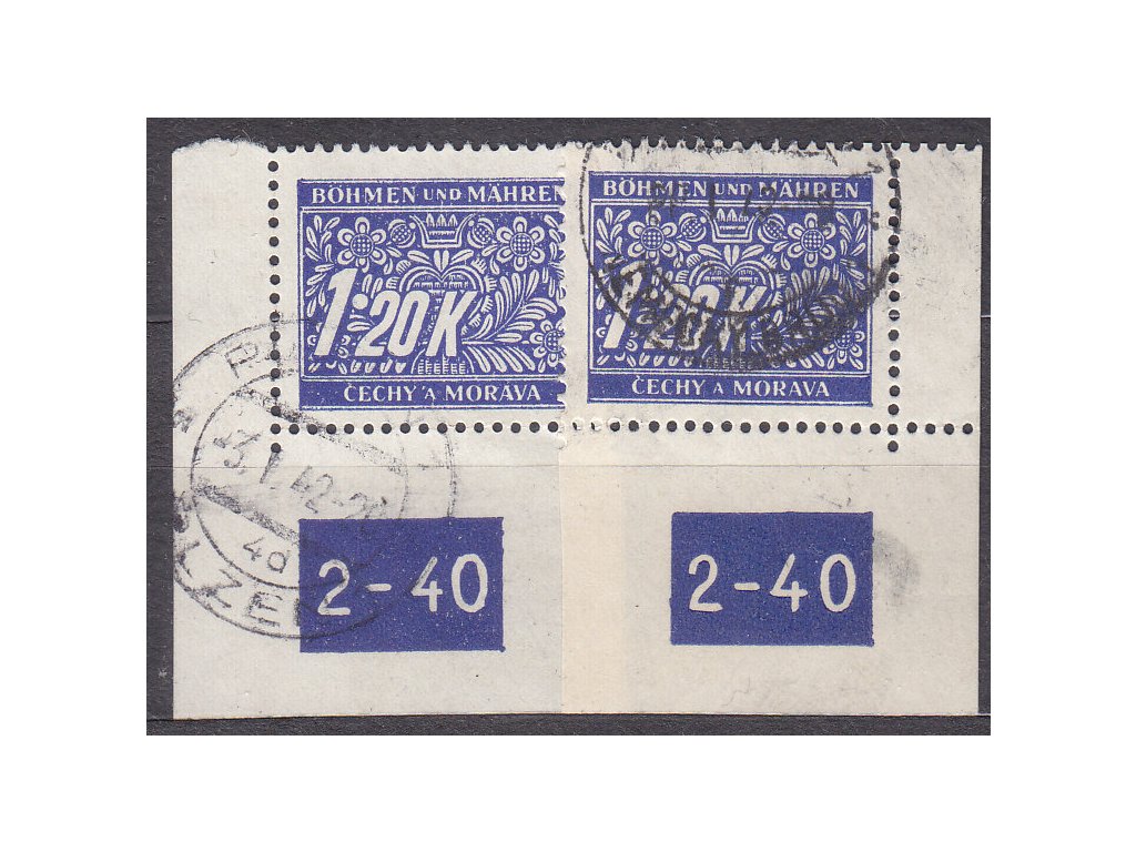 Doplatní známka 1.20K modrá, L+P rohové kusy s DČ 2-40 - Y-X, Nr.DL10, razítkované