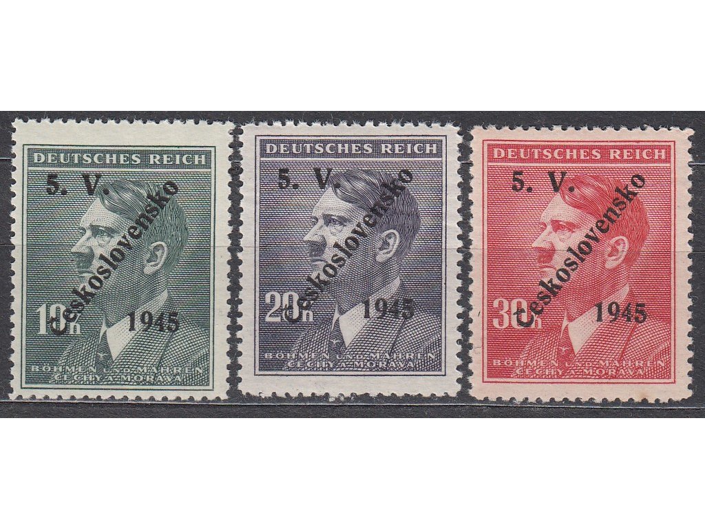 Poštovní známky 10,20 a 30K Hitler, přetisk 5.V. ČESKOSLOVENSKO 1945, **