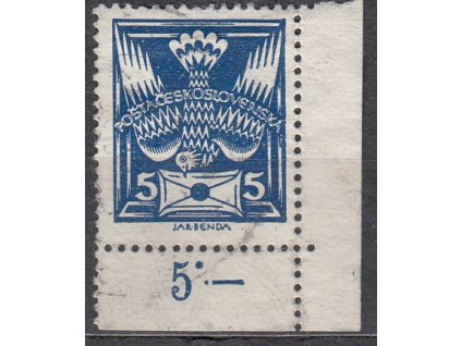 5h modrá, rohový kus s DZ - přerušená pomlčka, Nr.143, razítkované, vada - zeslabena na rubu