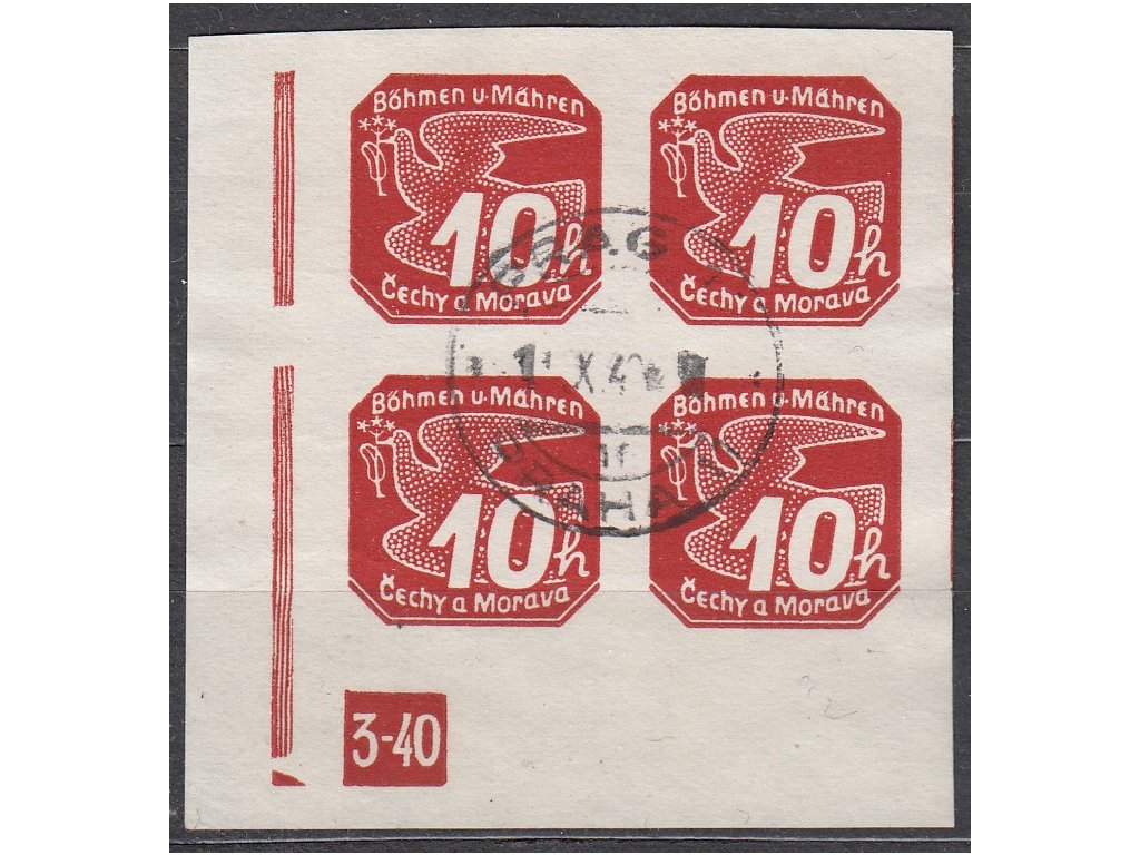 10h červená, levý roh. 4blok s DČ 3-40 - zakončení trojúhelník, Nr.NV5, razítkované
