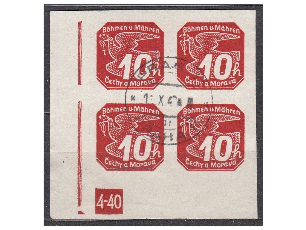 10h červená, levý roh. 4blok s DČ 4-40 - zakončení trojúhelník, Nr.NV5, razítkované