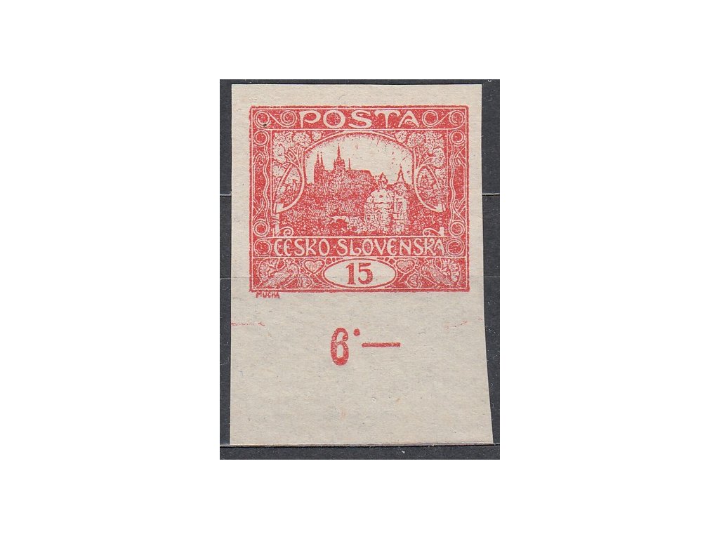 Známka Hradčany 15h cihlově červená, I.typ spirály, krajový kus s počitadlem, Nr.7, **