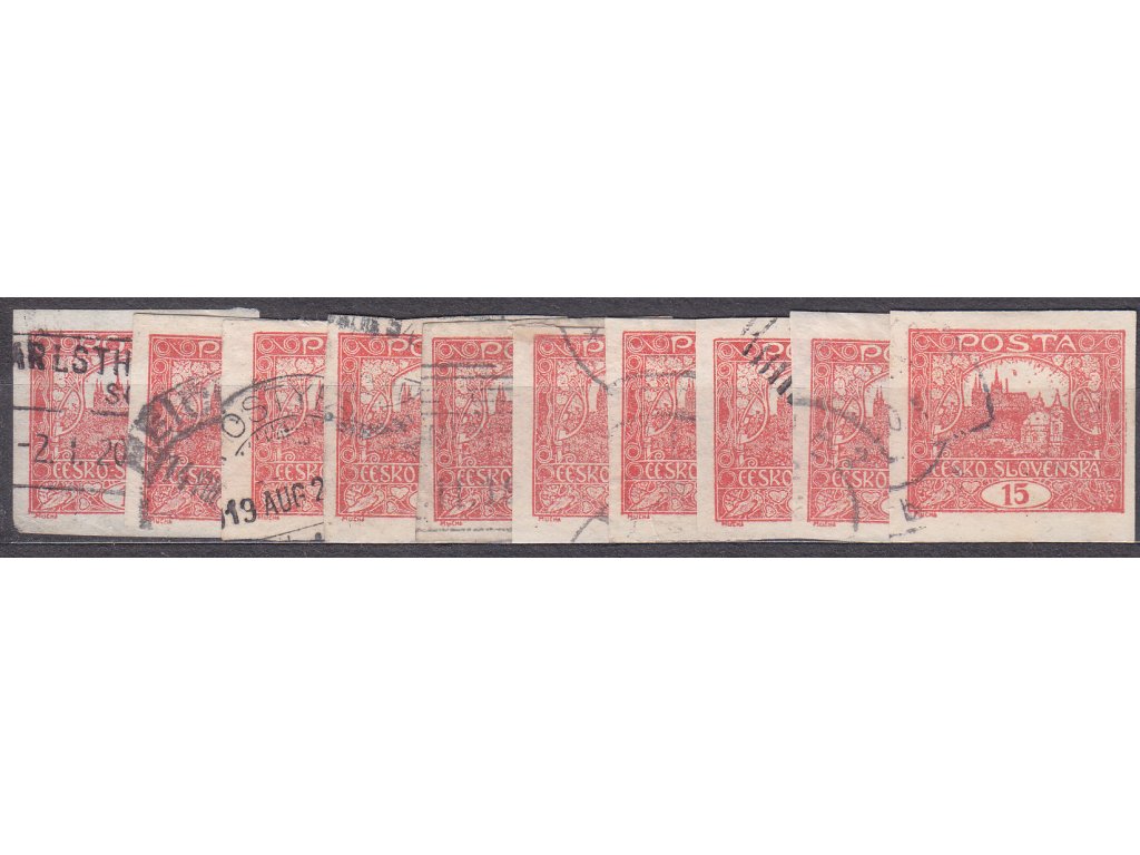 Známka Hradčany 15h cihlově červená, nezoubkované, 10 ks - vše I.typ spirály, Nr.7, razítkované