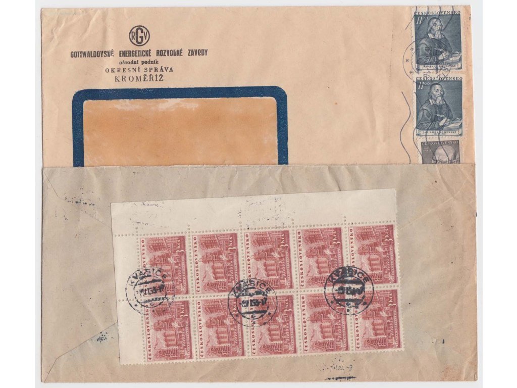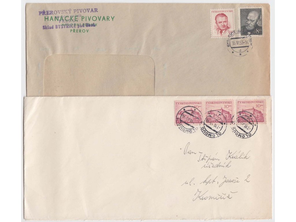 Měnová reforma, 16.6.1953, 4 kusy dopisů s různými frankaturami, podlouhlé formáty, DR Olomouc 1.6.53, Bystřice pod Hostýnem 16.6.53, Kvasice 8.6.53 a Kroměříž 16.6.53, různé frankatury a jakost