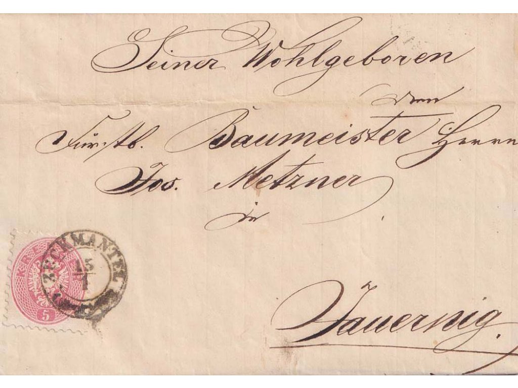 Poštovní celistvost, 1866, DR Zuckmantel, skládaný dopis vyfr. zn. 5 Kr Orlíček, prošlé v roce 1866, stopy pošt. provozu