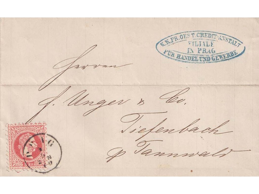1869, DR Prag, skládaný dopis vyfr. zn. 5 Kr Franc Josef, prošlé