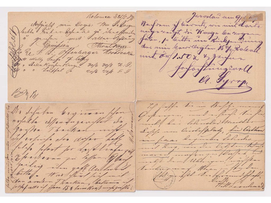 1875, 4 ks dopisnice 2 Kr žluťásek, DR Hall, Jaroslau, Rzeszów a Kolomyja