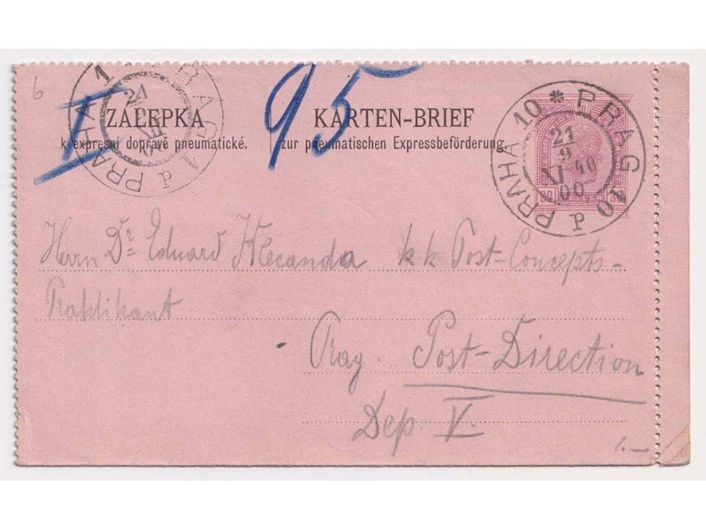 Potrubní pošta, 1900, Praha, zálepka Potrubní pošty 30 H Franc Josef, DR Praha, prošlé v roce 1900 v Praze, obvyklá jakost, hledané