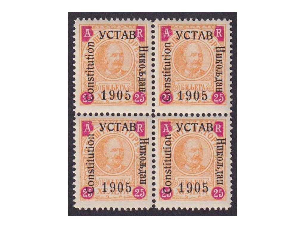 Poštovní známka, 1905, 25 H Nikola s přetiskem, 4blok, MiNr.60IV, **