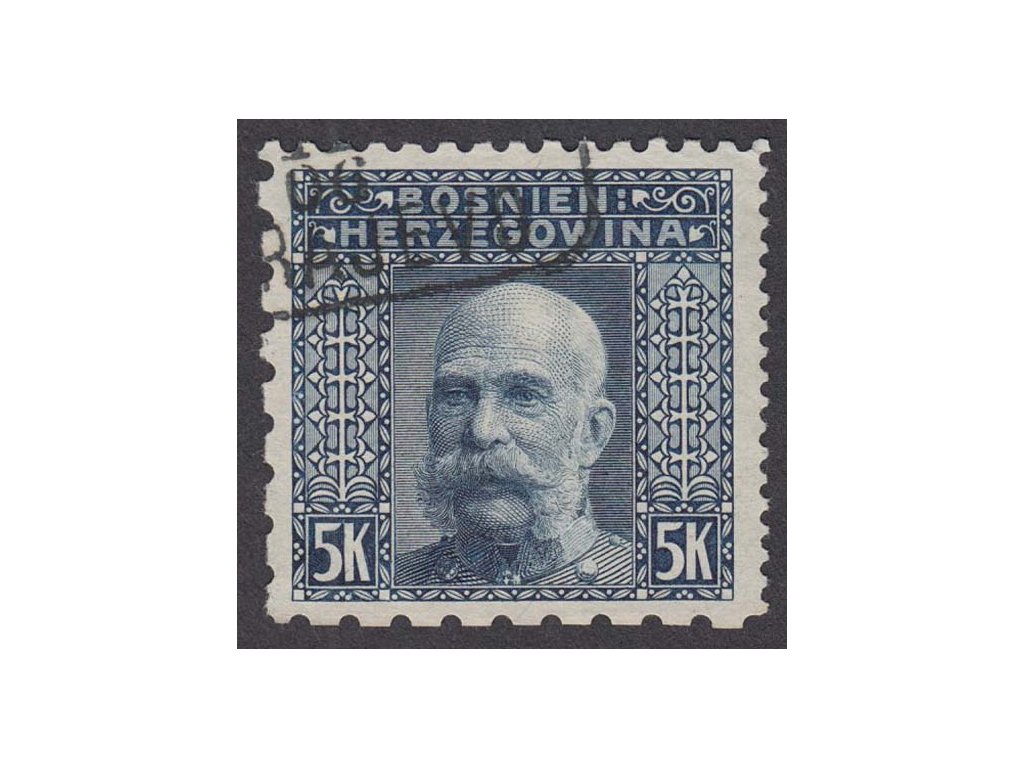Poštovní známka, 1906, 5 Kr Franc Josef, smíšené zoubkování, Nr.44, razítkované, lom v růžku