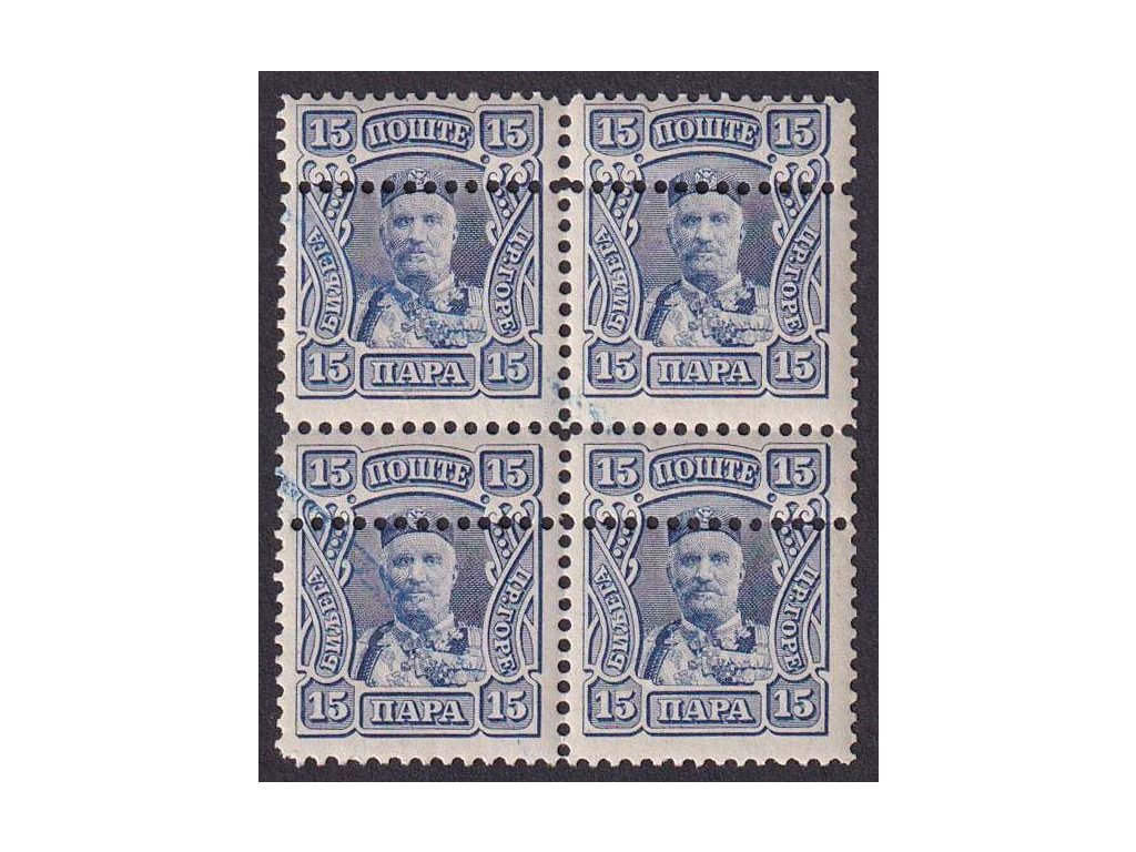 Poštovní známka, 1907, 15 Pa Nikola, posun perforace, MiNr.65, ** , 4blok, čárka modrou tužkou
