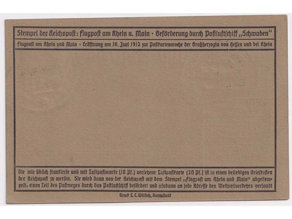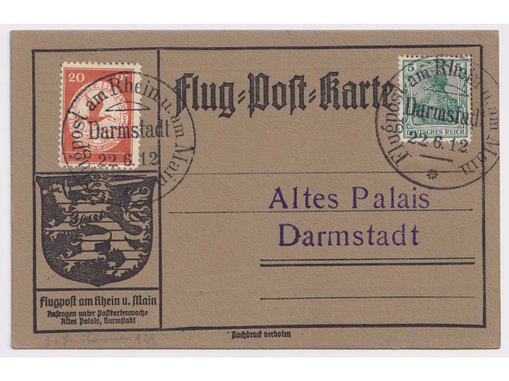 Letecká karta, 1912, letecká karta vyfr. zn. 5 Pf Germanie + letecká známka 20 Pf, DR Darmstadt, zasl. v roce 1912 v místě, hledané