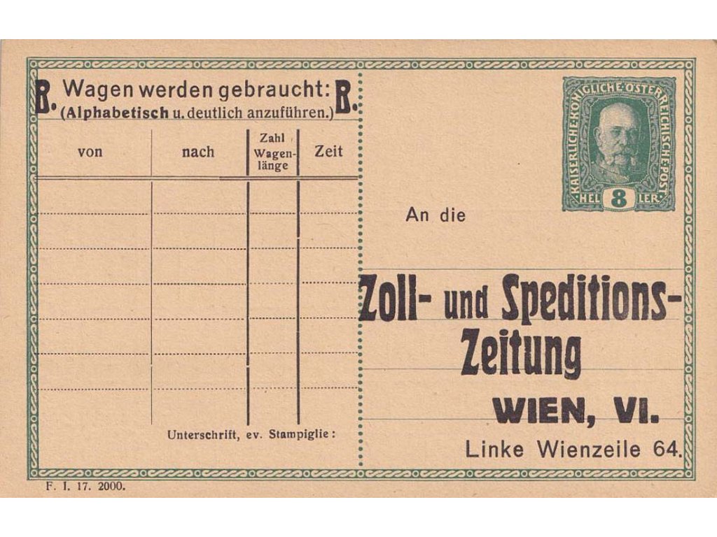 1916, Zoll-und Speditions-Zeitung, Wien, oboustranný přítisk na dopisnici