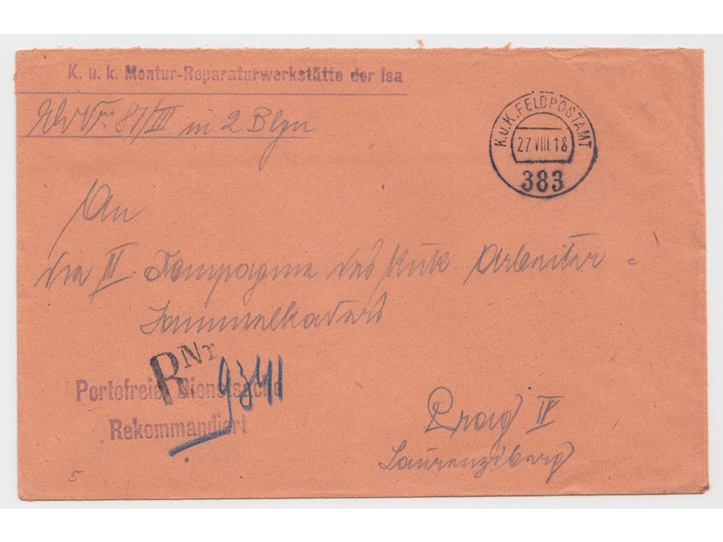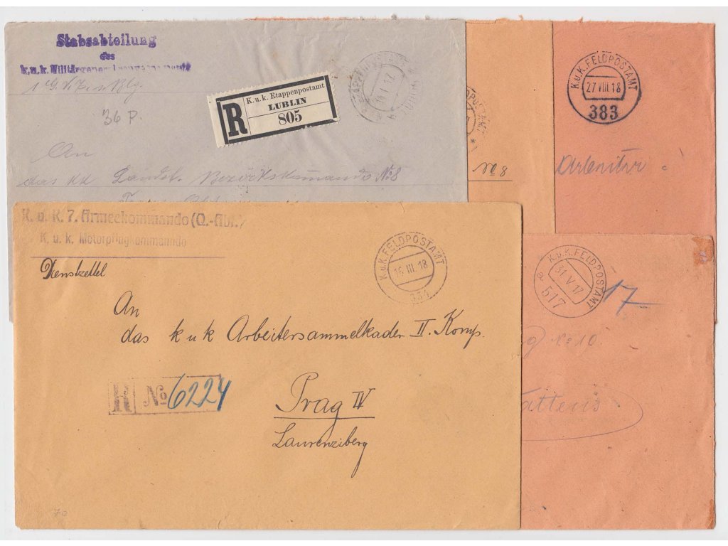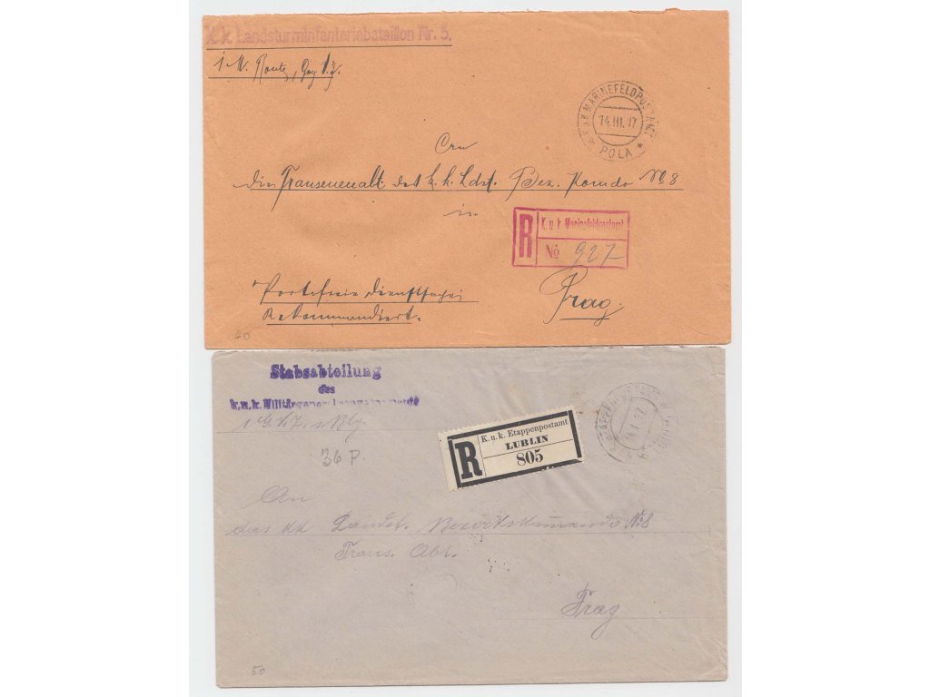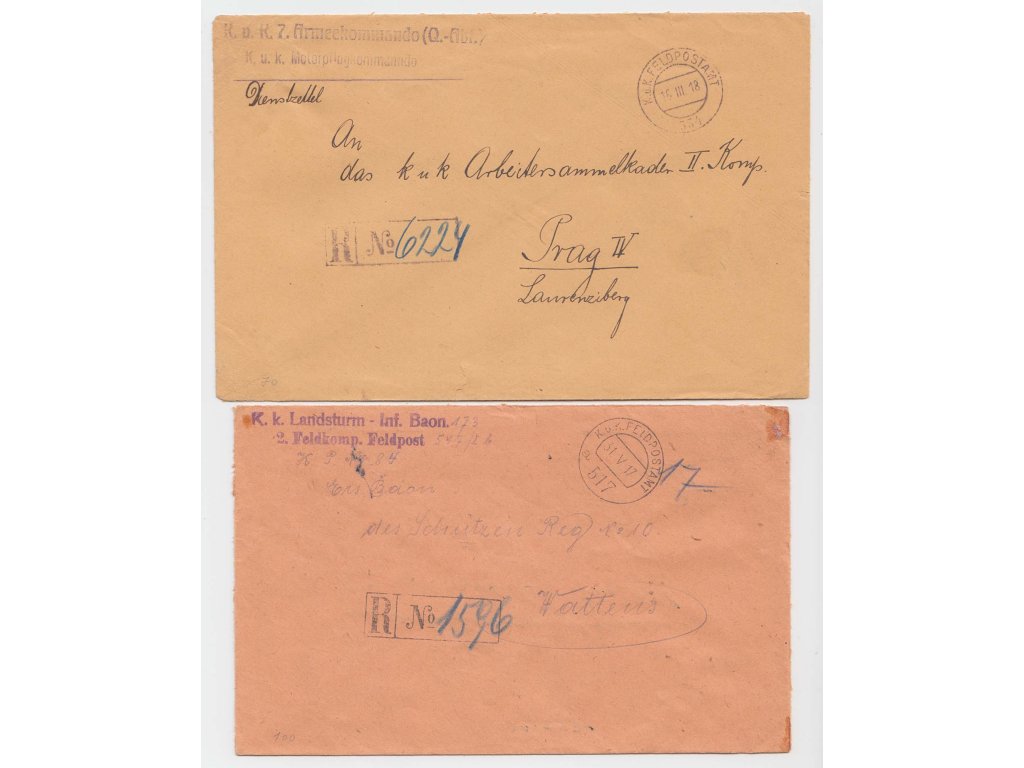 Feldpost, 5 kusů R-obálek PP, prošlé v letech 1917-1918, každá jiná, stopy stáří a poštovního provozu - viz. foto, hledané
