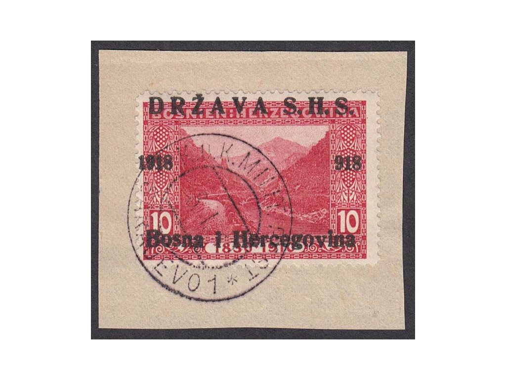 Poštovní známka, 1918, 10 H Krajinka, chybotisk přetisku "918" místo "1918", MiNr.3, výstřižek