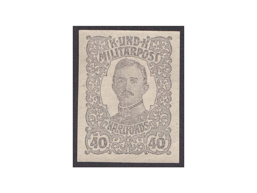 Poštovní známka, 1918, 40 H Karel, nezoubkovaný ZT (zkusmý tisk) v barvě šedé na známkovém papíru s lepem, MiNr.146U, **