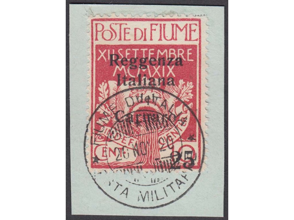 Poštovní známka, 1920, Carnaro, 25C/10 C Znak s přetiskem, MiNr.10, razítko Fiume D´Italia Posta Militare, výstřižek