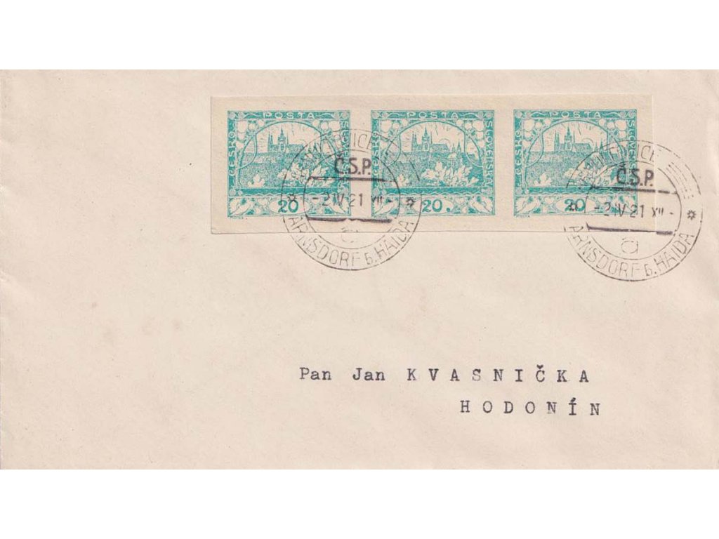 Poštovní celistvost, 1921, DR Arnultovice, dopis zasl. do Prahy, DV - tečka za "20", stopy poštovního provozu