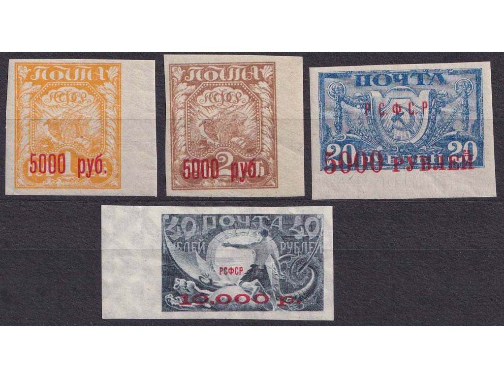 Poštovní známka, 1922, 5000R/1R-10000R/40R přetisková série, chybí jedna známka, MiNr.171b,172b,174b,175b, ** , archové lomy
