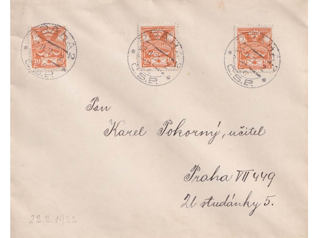 1922, Praha 2 22.2.22-2, oblíbené dvojkové datum, dopis zasl. v Praze