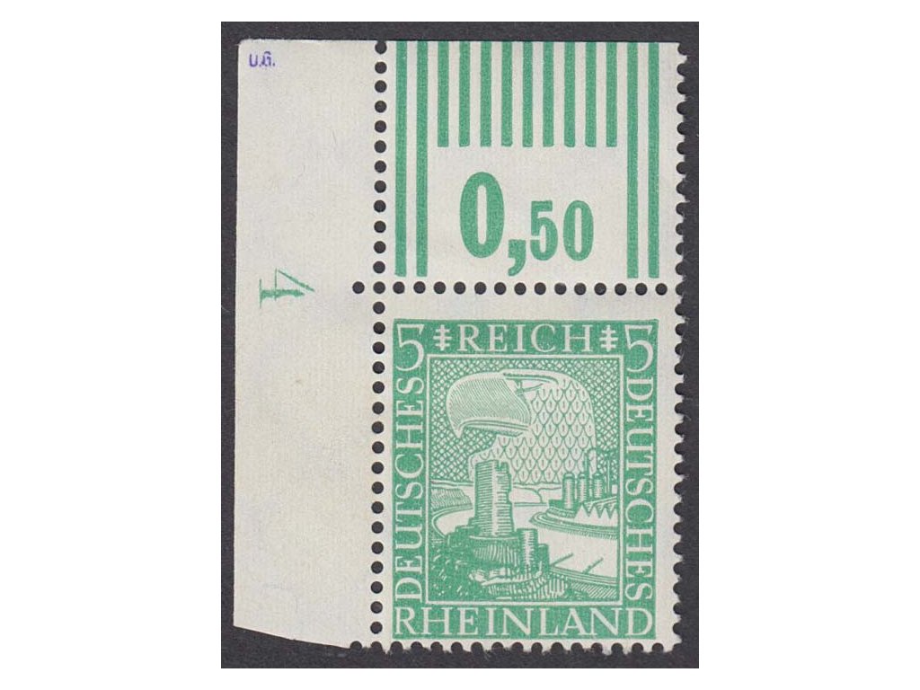 Poštovní známka, 1925, 5 Pf Rheinland, roh. kus, MiNr.372, * po nálepce