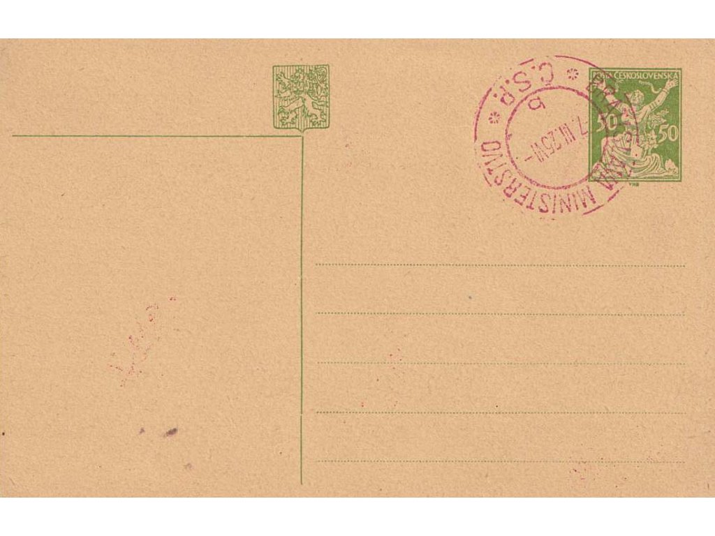 Pamětní razítko, 1925, Bratislava ministerstvo, dopisnice 50 h O.R., neprošlé, dv