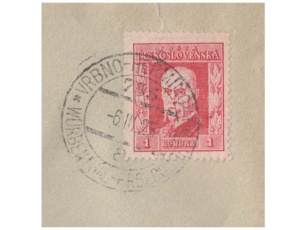 1925, dopis vyfrankovaný známkou 1 Kč TGM, typ I., svislá průsvitka!, vlakové razítko Vrbno-Heřmanová, zasláno do Prahy, stopy poštovního provozu