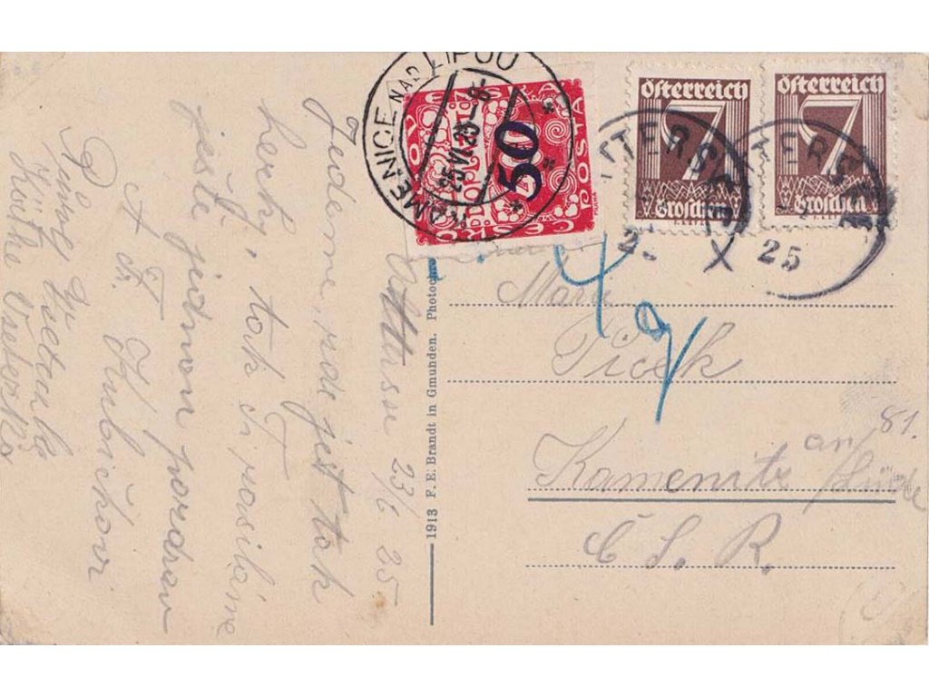 Doplatní, 1925, pohlednice zasl. z Rakouska do ČSR, zde zatíženo dopl. zn., DR Altersee resp. Kamenice nad Lipou, stopy pošt. provozu