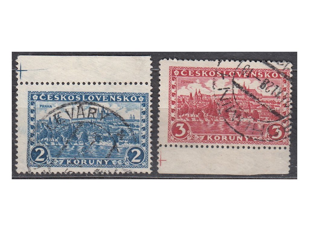 Poštovní známky 1926, 2 a 3Kč Praha, krajové kusy s křížkem na okraji, Nr.225, 230, razítkované