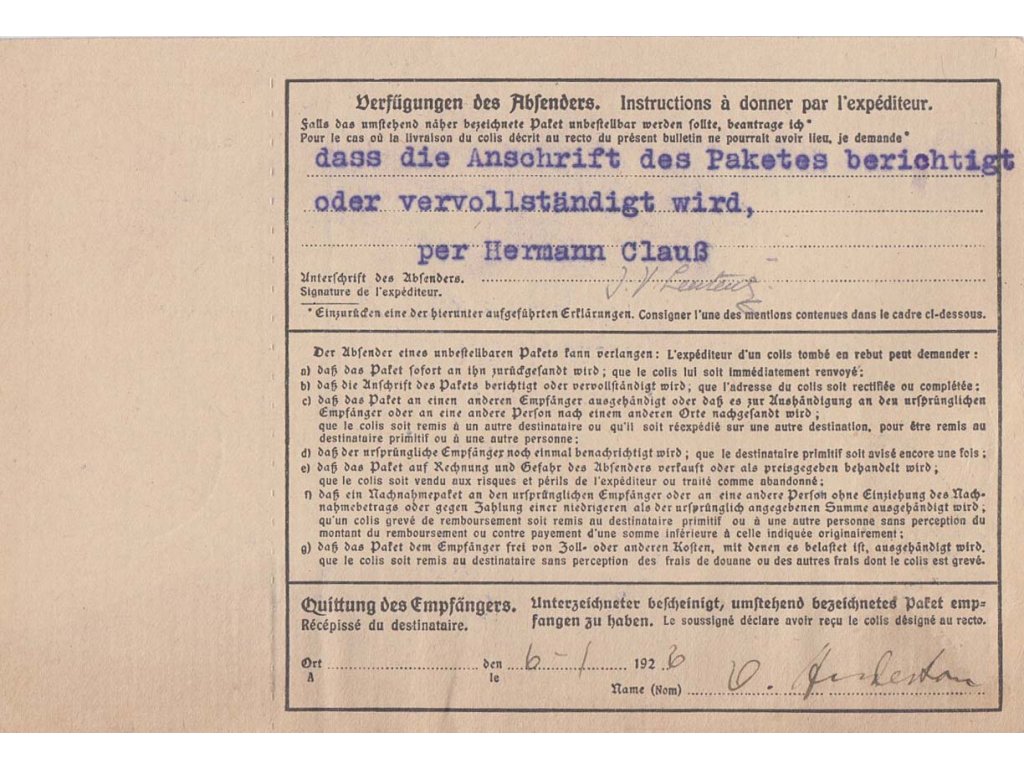 Poštovní formulář, 1926, DR Neustadt, kompletní formulář, zasl. do Osla, stopy pošt. provozu