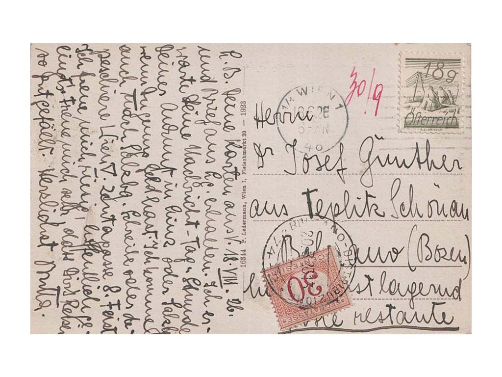 Pohlednice, 1926, DR Wien, pohlednice zaslaná do Itálie, doplatné na Poste Restante, stopy pošt. provozu