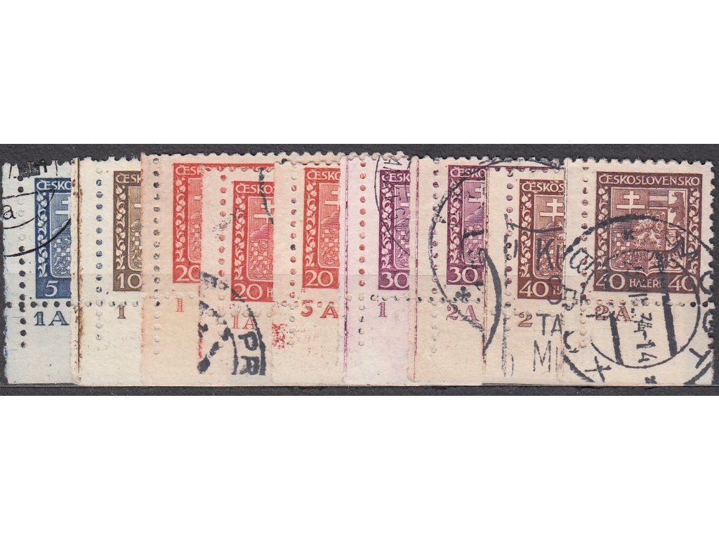 Poštovní známky 1929, 5-40h Znak, 9 ks rohových zn. s DČ - každé jiné, razítkované