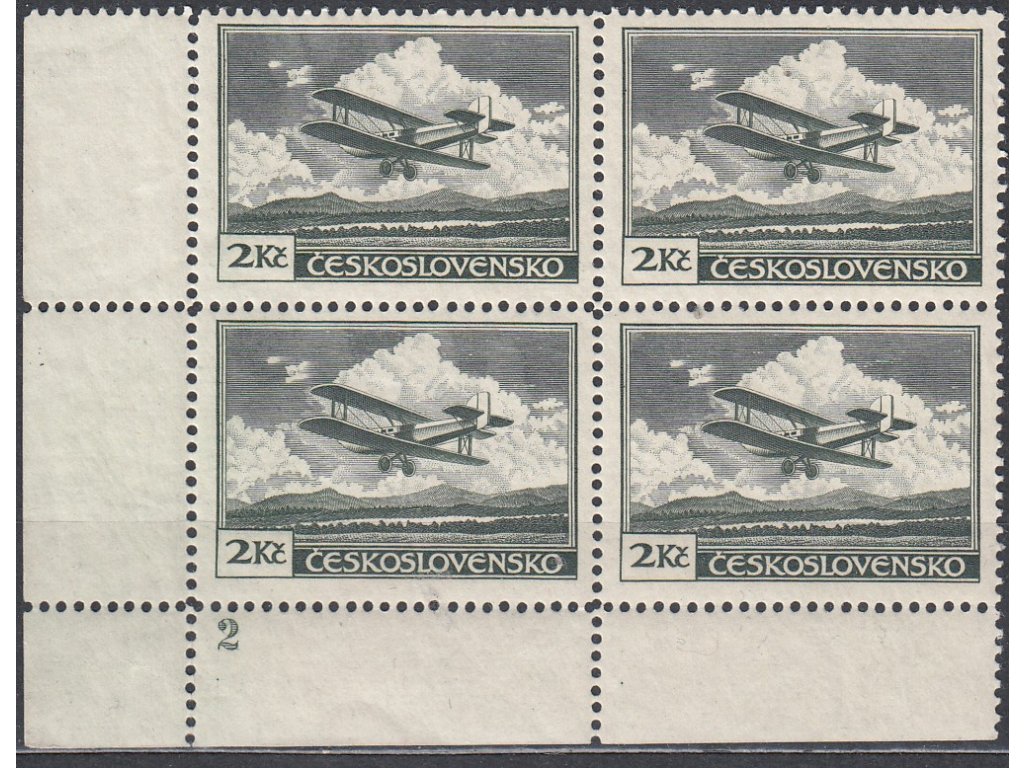 Letecká známka 1930, 2Kč zelená, roh. 4blok s DČ 2, Nr.L9, **, ilustrační foto