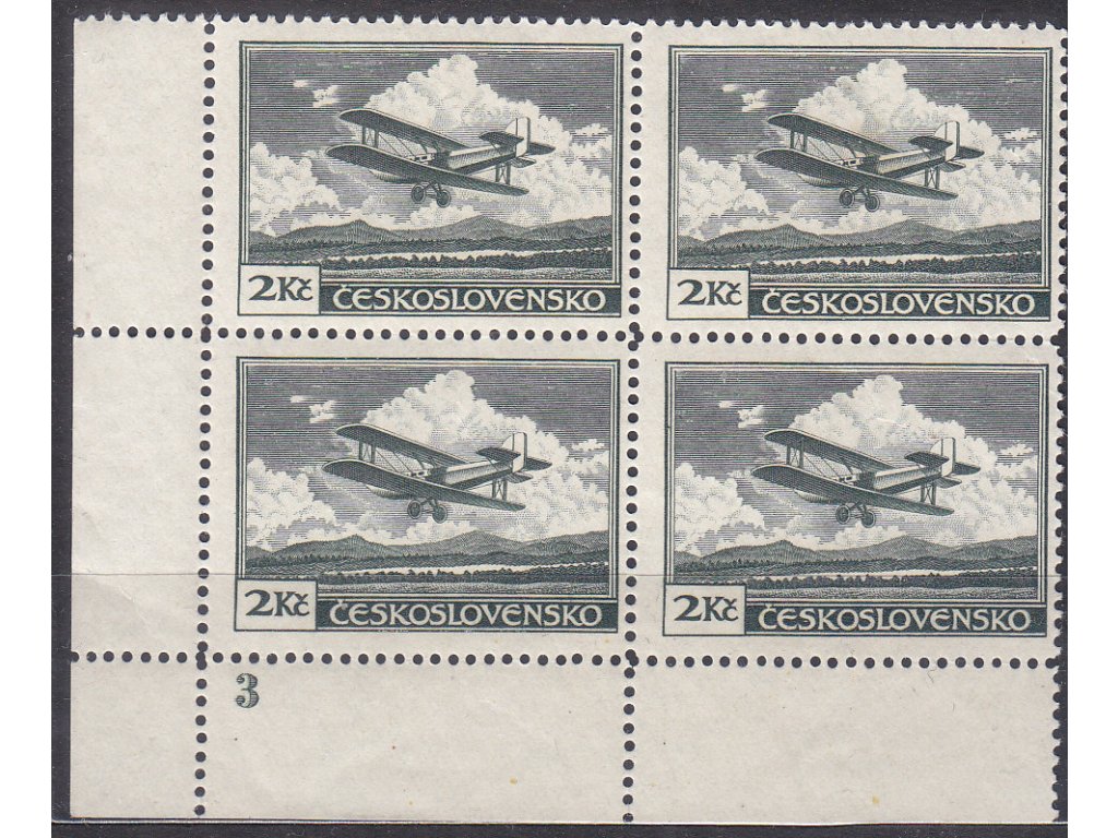 Letecká známka 1930, 2Kč zelená, roh. 4blok s DČ 3, Nr.L9, **