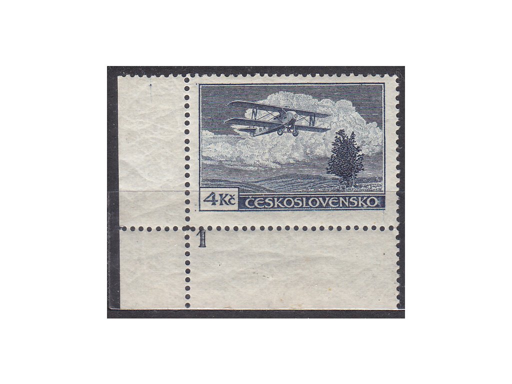 Letecká známka 1930, 4Kč modrá, rohový kus s DČ 1, Nr.L11, * po nálepce, ilustrační foto