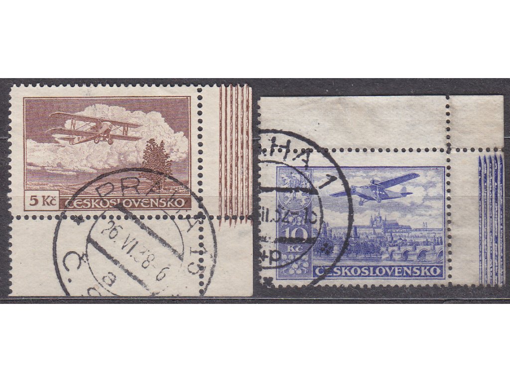 1930, 5 a 10Kč Letecké, rohové kusy s bordurou na okraji, razítkované