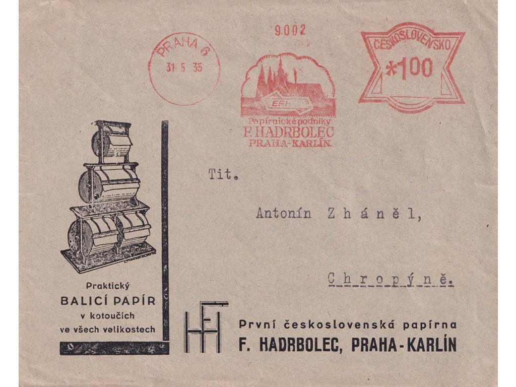 1935, DR Praha, frankotyp F.Hadrbolec, obálka zaslaná do Chropyně,