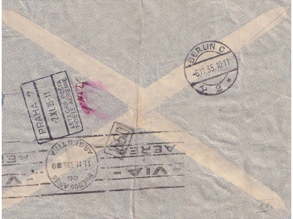 Poštovní celistvost, 1935, DR Praha, let. dopis zasl. v roce 1935 do Argentiny, pestrá frankatura, přeloženo mezi známkami, všechny náležitosti, horší jakost - viz. foto