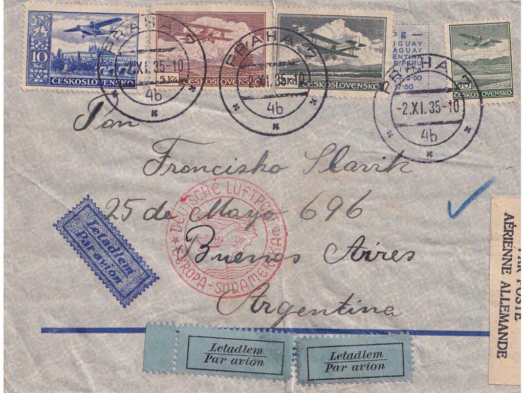 1935, DR Praha, let. dopis zasl. v roce 1935 do Argentiny, pestrá frankatura,