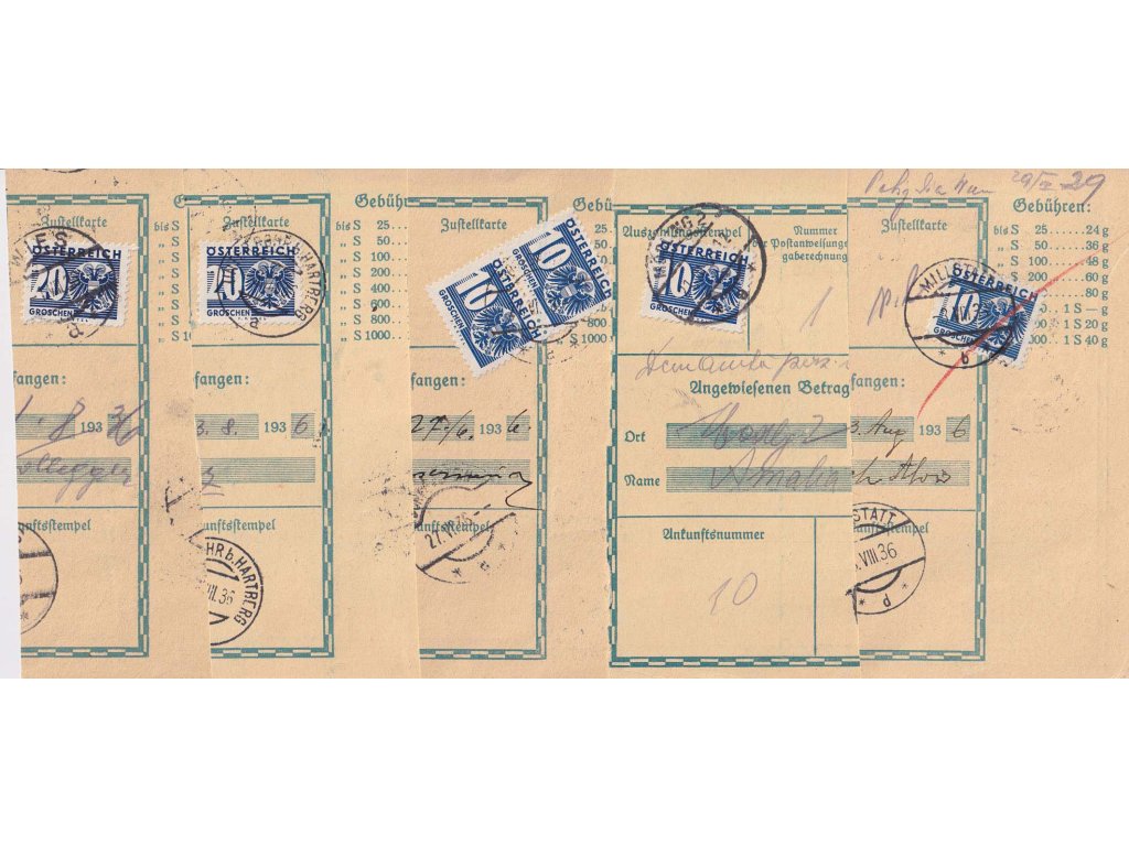 Poštovní celistvosti, 1936, 5 kusů útržků frankovaných formulářů