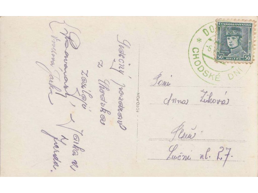 Pamětní razítko, 1936, Domažlice, Chodské dni, pohlednice zasl. do Plzně