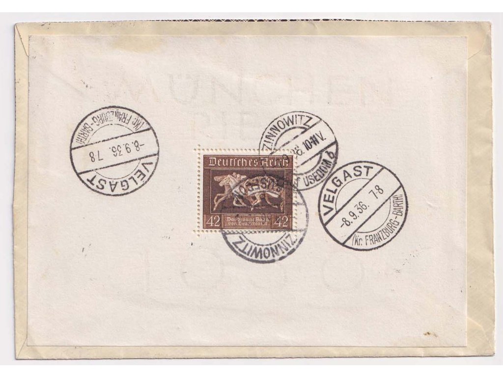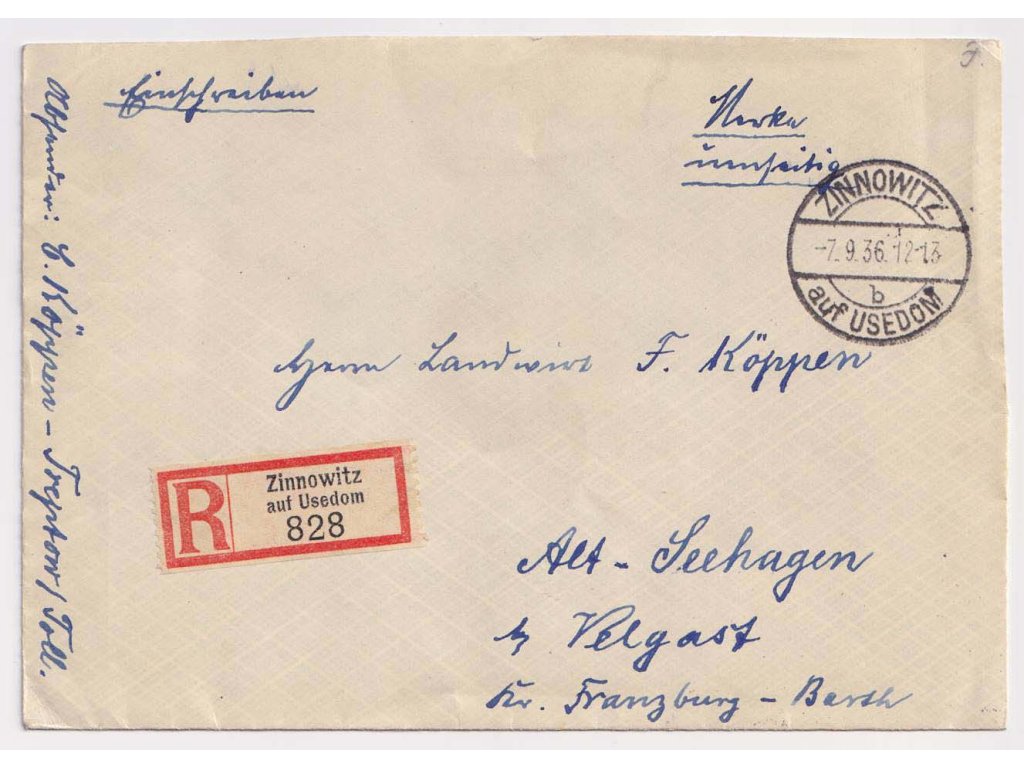 Poštovní celistvost, 1936, R-dopis vyfr. na rubové straně aršíkem 42 Pf Hnědá stuha, DR Zinnowitz, zasl. v roce 1936 v Německu, otevřeno ze 2 stran, zajímavé