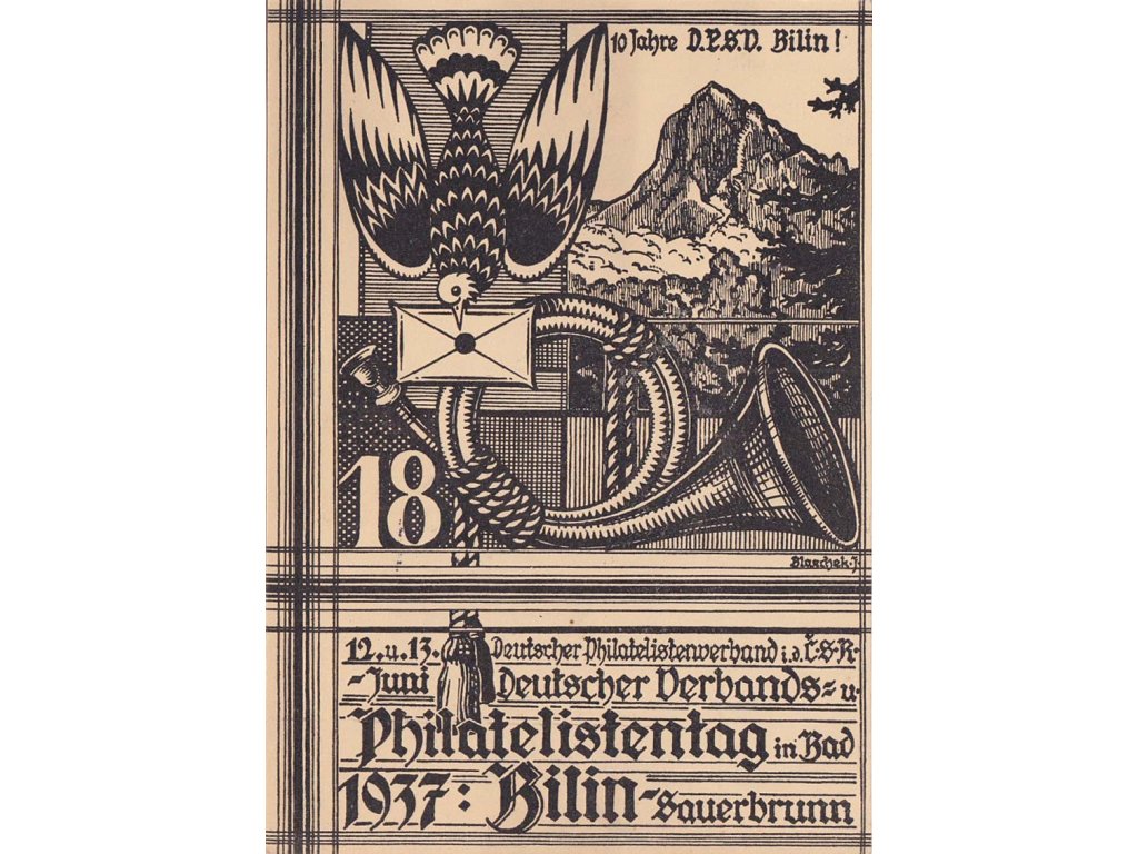 1937, Bílina, XVIII. Sjezd německých filatelistů, propagační pohlednice,