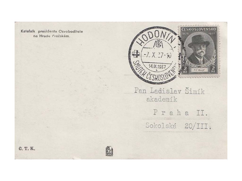 Pamětní razítko, 1937, Hodonín, Smutek Československa, pohlednice zaslaná do Prahy, stopy pošt. provozu