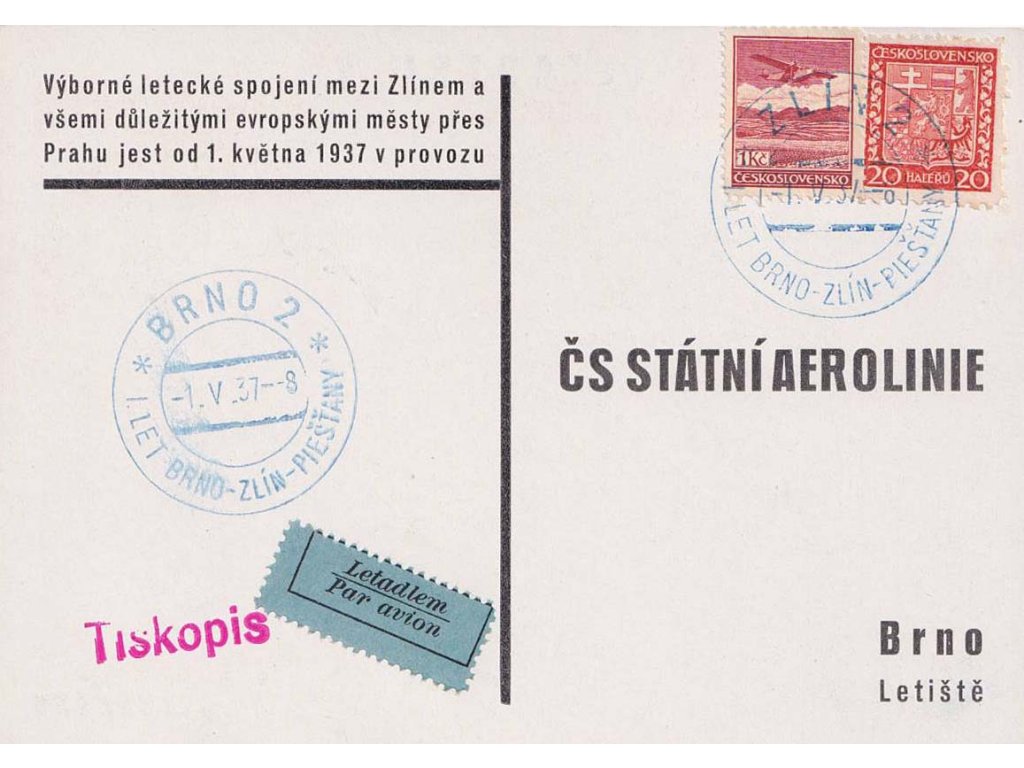 Pamětní karta, 1937, I. let Brno-Zlín-Piešťany, propagační karta, prošlé