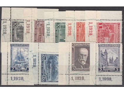 1928, 30h-5Kč Jubilejní, bez 1.20Kč, rohová série s DČ, pamětní razítko, Nr.233-7,339-42