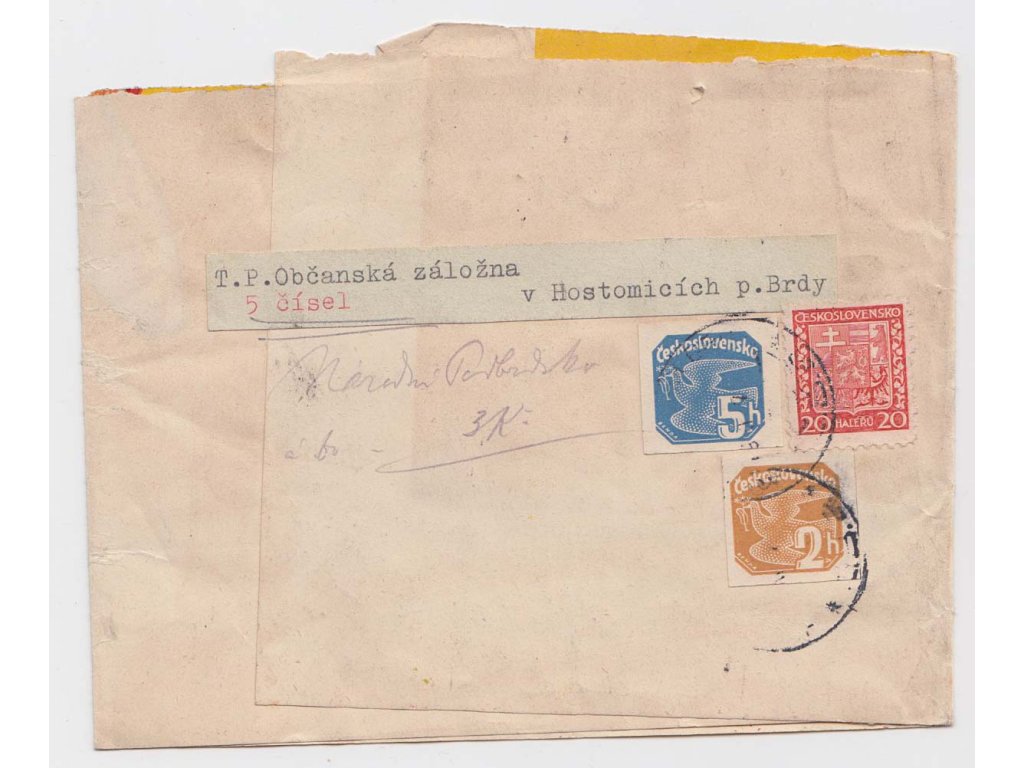 Poštovní celistvost, 1937, novinová páska vyfr. pestrou frankaturou novinových a výplatních známek, DR Hostomice pod Brdy, prošlé v roce 1937, horší jakost - viz. foto, vzácné