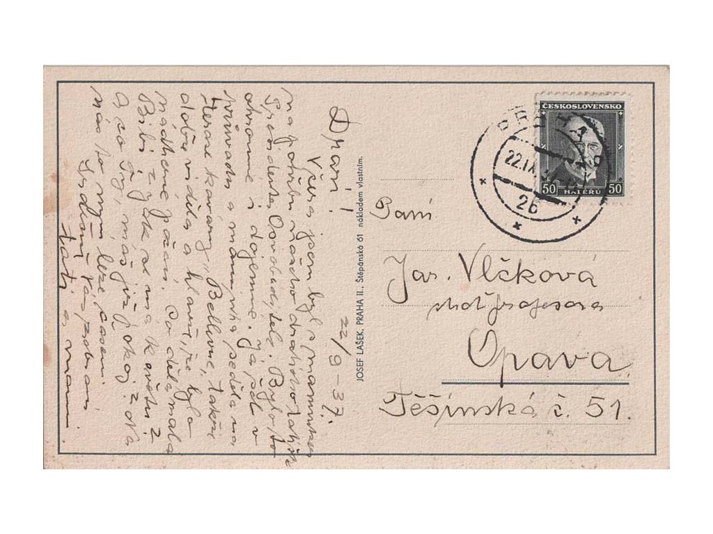 1937, Praha, T.G. Masaryk, propagační pohlednice zasl. do Opavy